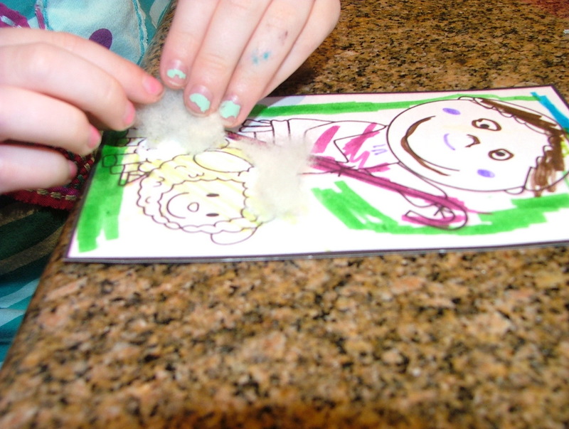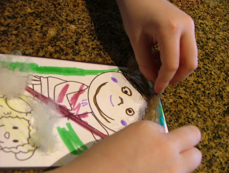 She used roving for baby Jesus’ hair and a scrap piece of cloth and straw for the manger.