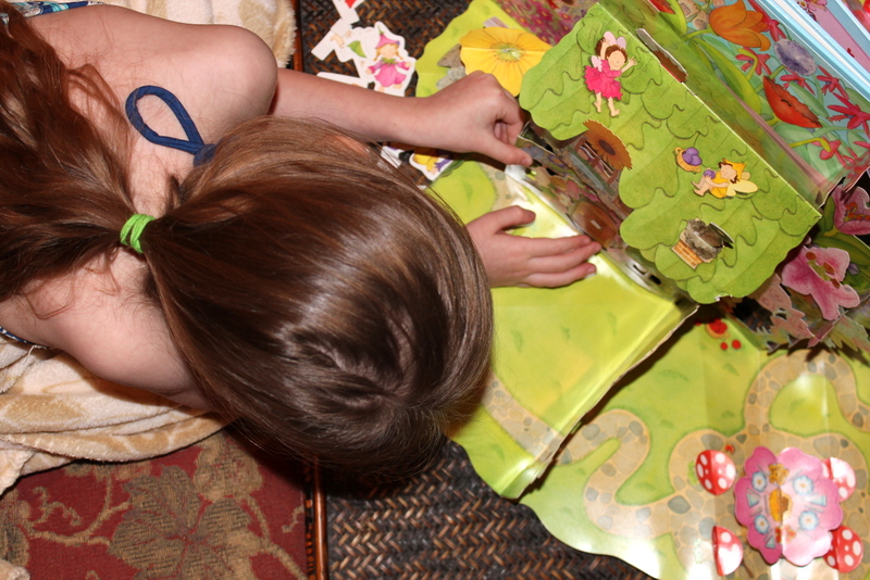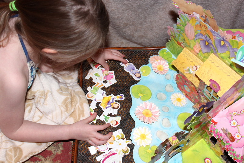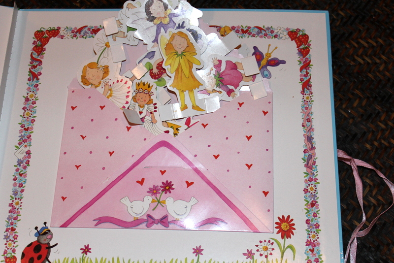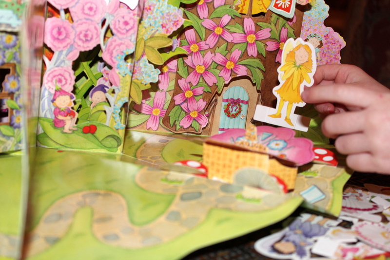 then opens up to a pop-up world of fairy land. Inside the book are several little fairy paper dolls that they can play with.