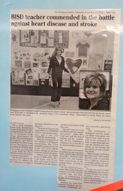 And this year, out of 2000 candidates, Mrs. Cook was one of the 35 recipients of the Texas Association for Health, Physical Education, Recreation and Dance/Jump Rope For Heart grants for her outstanding work in educating our children about heart disease.