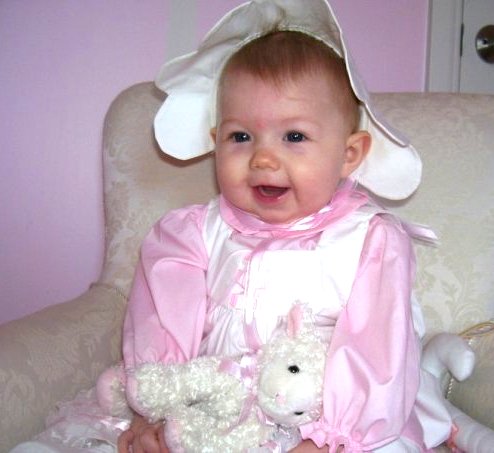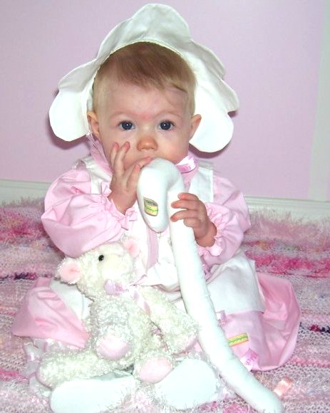 The outfit looks SO cute, especially when she is carrying the lamb. Wow, she is looking more and more like her sister!