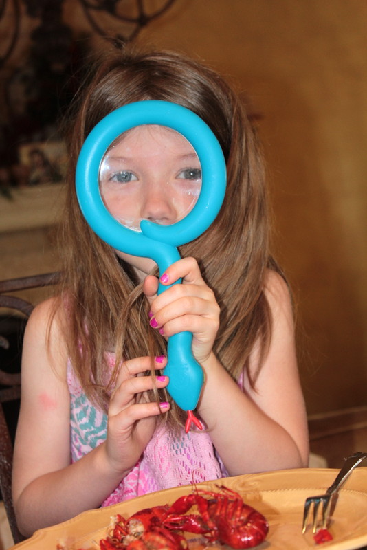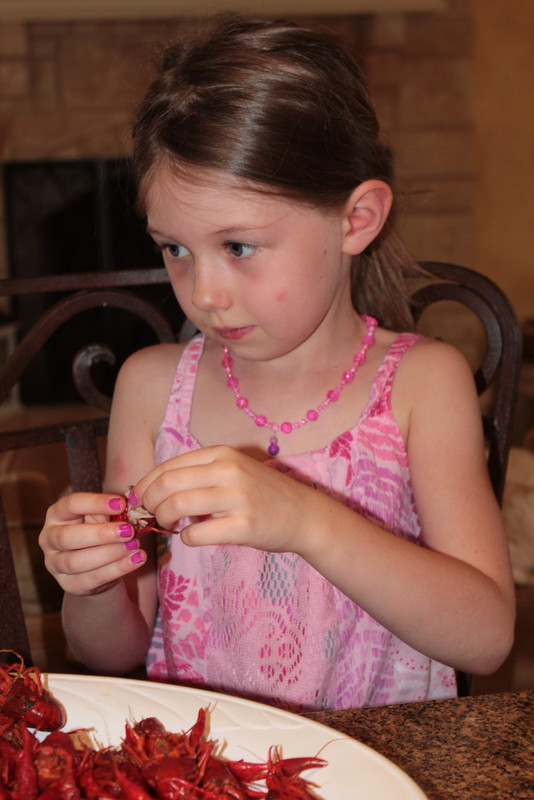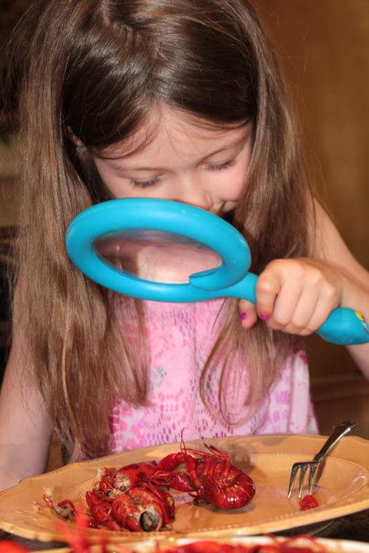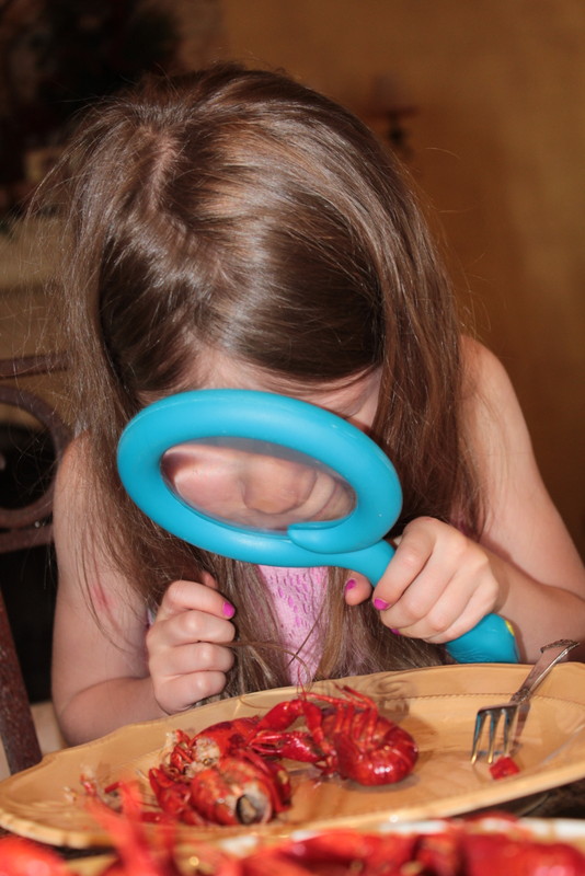She spent the time that it took for gumps to shell the the crawfish to examine them a little closer. She inspected every inch of just about every crawfish on the plate, with much delight.