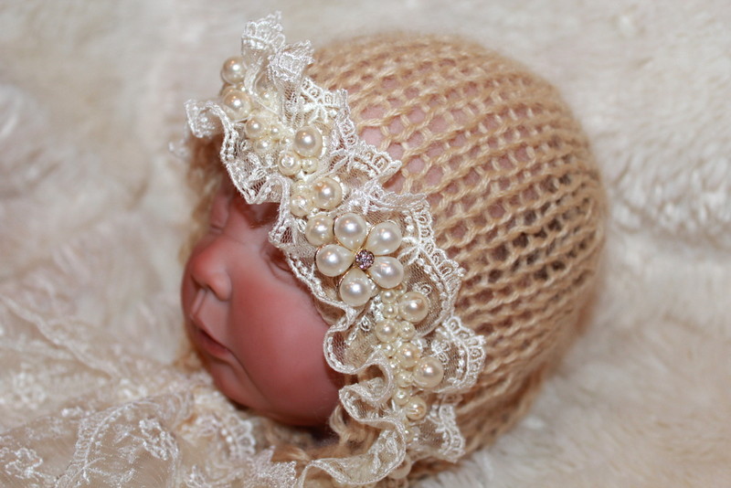 A matching baby bonnet drips with pearl beads and also has a matching pearl flower button. It ties with lace.