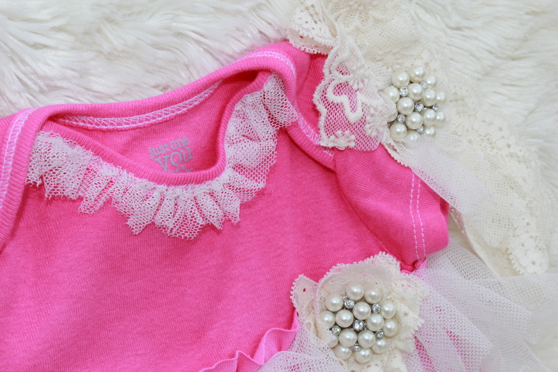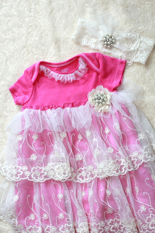 Starting the clothing at size 3 months is the hand dyed pink baby gown. Covered with layers of off white lace and decorated with a sparkle pearl button. A stretch lace head band with the same button is included with this gown.