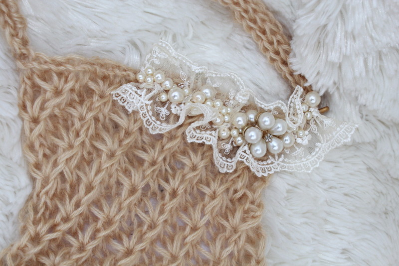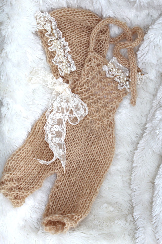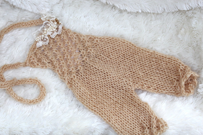 Also coming in at 3 months is a hand knit halter overall set. The overalls stretch so it may work past the 3 month size. The overalls are knit with a double strand of lace yarn and is decorated with lace and pearl beads, topped with a pearl flower button. This is meant to be a photo prop.