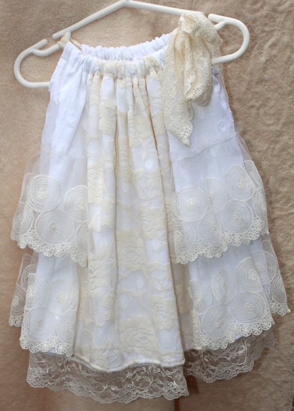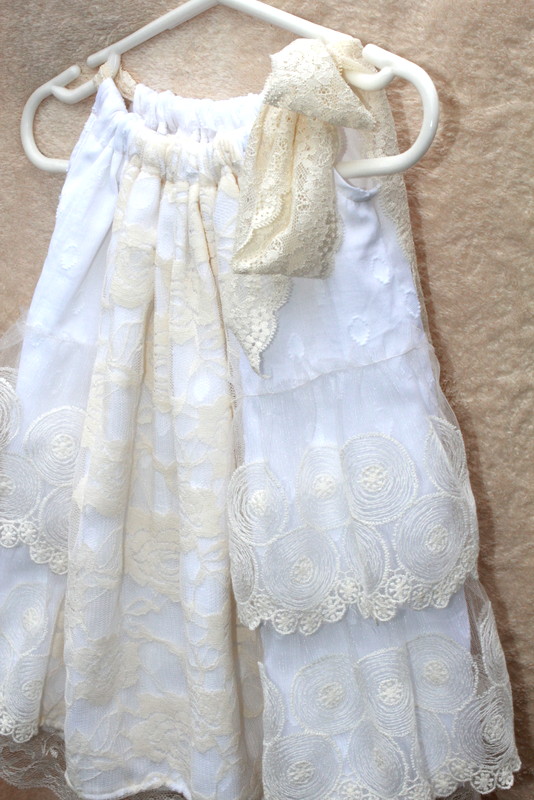 A pillowcase dress is our 9 month outfit. The white background is contrasted with layers of off white lace. It ties at one shoulder with lace.
