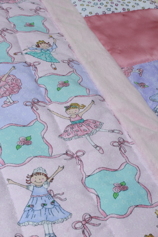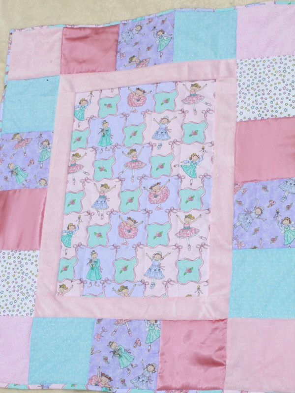 We start this basket with a pieced quilt. This quilt has several different colors and textures, including the wonderful, soft minky fabric . Assorted soft pinks, blues and purple frame in the little ballerinas as they dance their way across the quilt. Machine pieced and machine quilted.