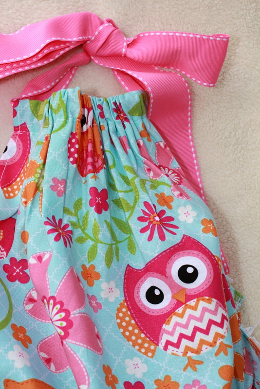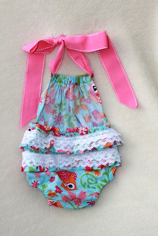 The 6 months size is a halter bubble with ruffles and lace. Flowers and owls are on this fun, bright fabric.