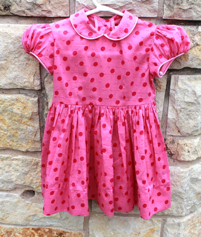 No little girl’s wardrobe is complete without some kind of vintage clothing. Size 18 months is made from one of my vintage patterns. Also made with dotted swiss fabric, pink on pink polka dot. The collar and sleeves are trimmed with pink piping. A classic style that never goes out.