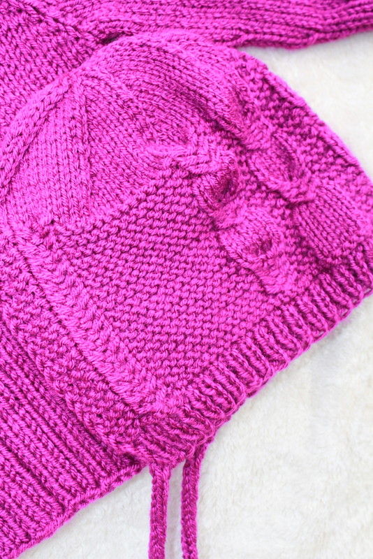 The bonnet has several rows of cable knit.