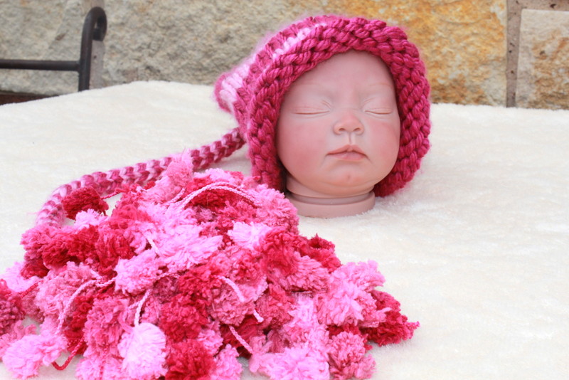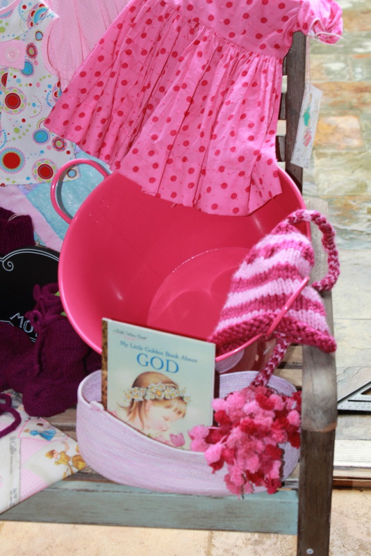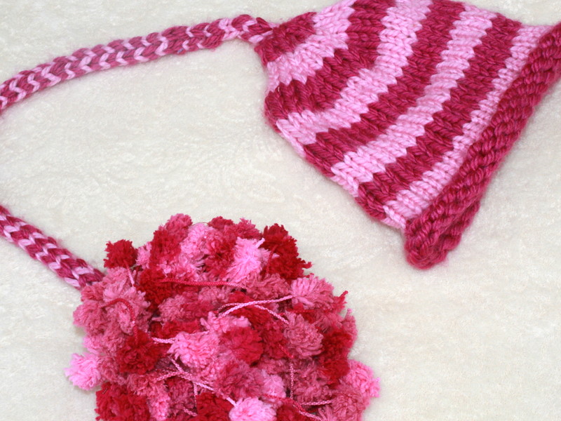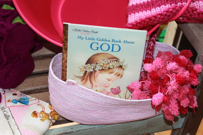 A hand knit photo prop hat was knitted and donated to this basket by my precious daughter. She used two different shades of pink yarn to create this fun hat.
