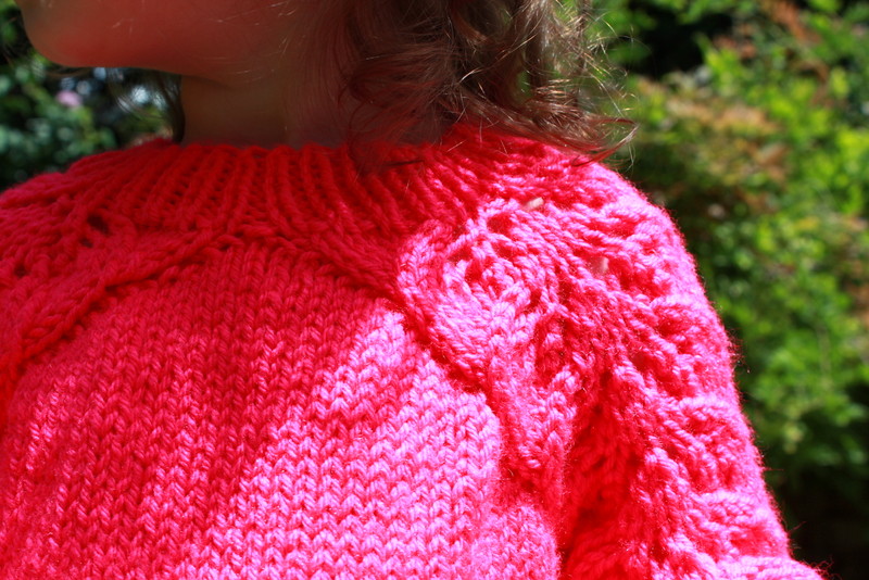 This sweater has a gorgeous lace pattern that flows from the neck line down the sleeves. The collar, cuffs and bottom hem are ribbed.