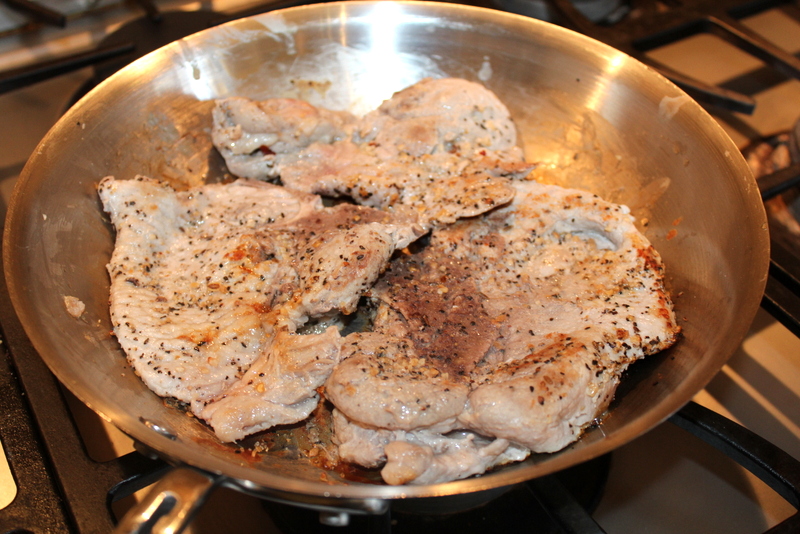 Brown the pork chops on the stove seasoned with your favorite seasoning.