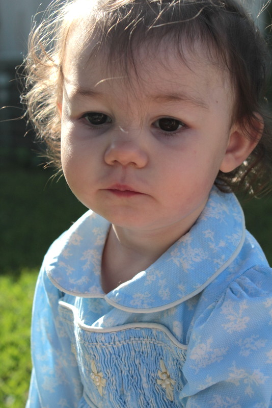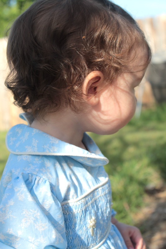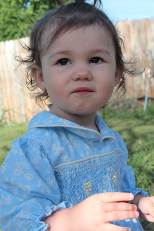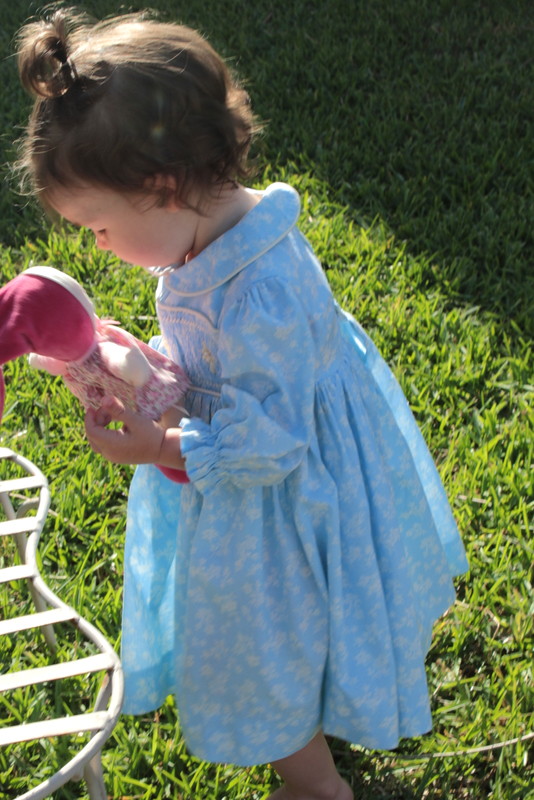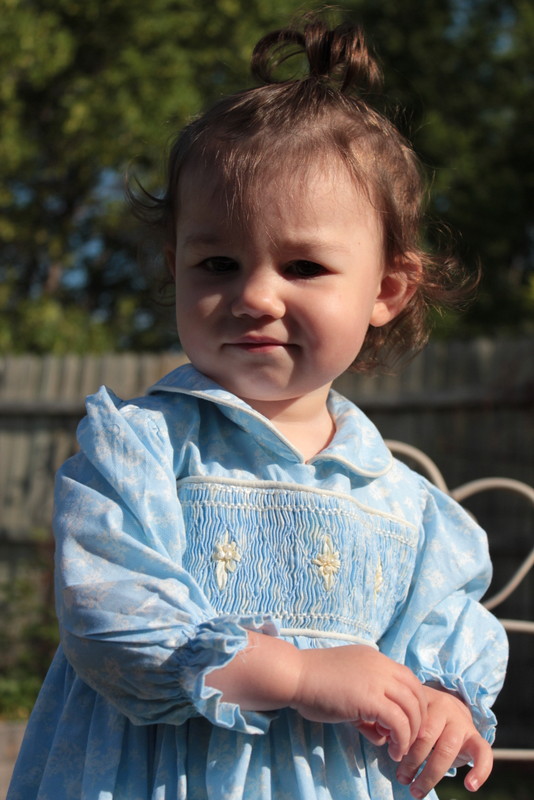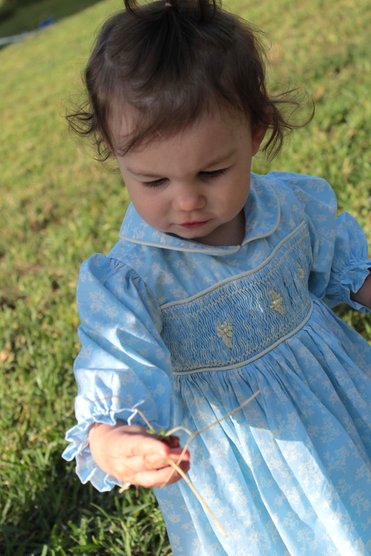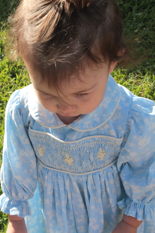 I have been itching to get back at it and have actually cut out a couple of patterns, but nothing is completed yet. So I am reaching way back in the closet, about four years worth and pulling out a smocked dress that I made for Aria to wear to my nephew’s wedding.
